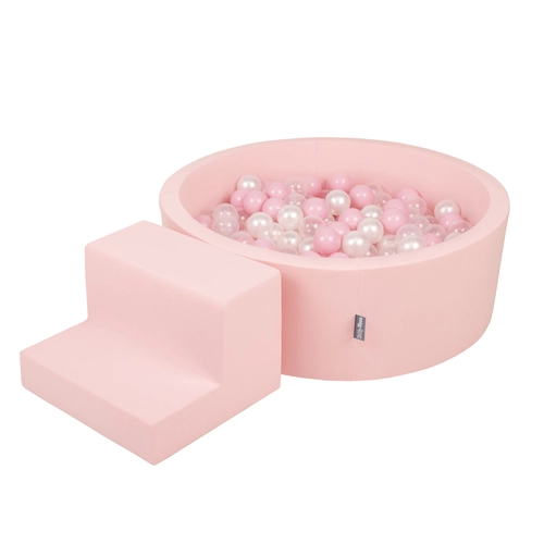 KiddyMoon Aire De Jeux en Mousse avec Rond Piscine à Balles pour Enfants, rose:rose poudre/perle/transparent, Piscine (100 Balles) + Marches