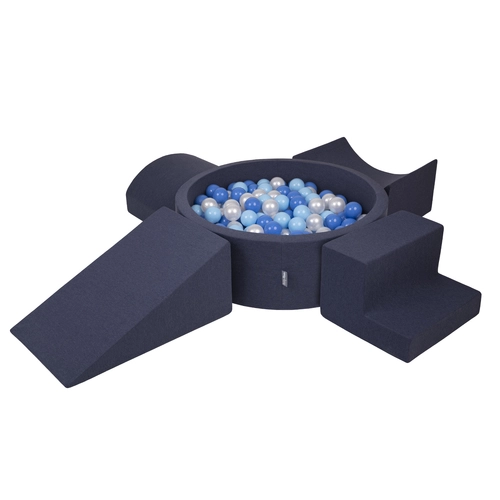 KiddyMoon Aire De Jeux en Mousse avec Rond Piscine à Balles pour Enfants, bleu foncé:babyblue/bleu/perle, Piscine (100 Balles) + Marches