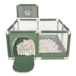 parc bébé avec balles plastiques aire de jeu pliable basket, vert : beige pastel/blanc/menthe, 200 balles