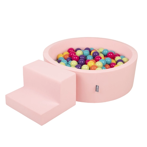 KiddyMoon Aire De Jeux en Mousse avec Rond Piscine à Balles pour Enfants, rose:vert clair/jaune/turq/orange/r.foncé/violet, Piscine (100 Balles) + Marches