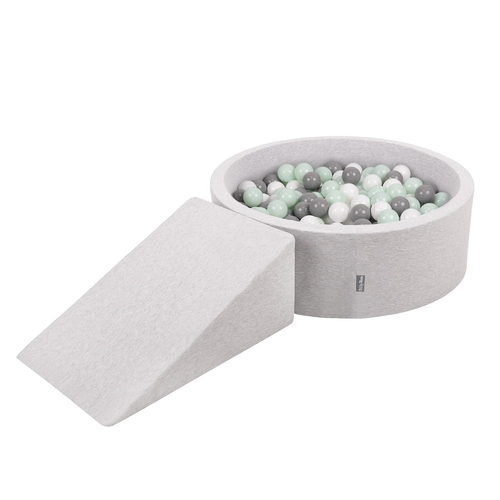 KiddyMoon Aire De Jeux en Mousse avec Rond Piscine à Balles pour Enfants, gris clair: blanc/gris/menthe, Piscine (200 Balles) + Pente