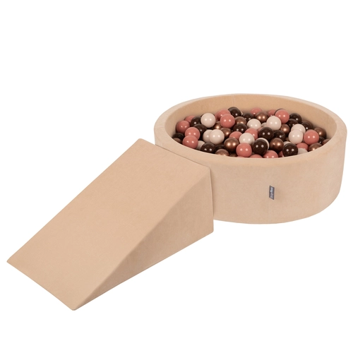 KiddyMoon Aire Velvet De Jeux en Mousse avec Rond Piscine à Balles pour Enfants, beige sableux: brun/cuivre/beige pastel/saumon, Piscine (200 Balles) + Pente