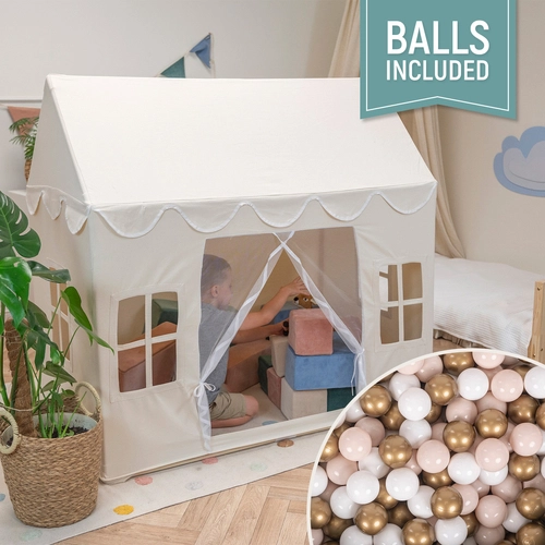 KiddyMoon Tente de Jeu Pour Enfants Maison De Jeu Pliable Tente Enfant Espace Créatif Pour Enfants Coin Douillet Idéal Pour Jouer À L’Intérieur Et À L’Extérieur, naturel: beige pastel/blanc/or, 300 Balles