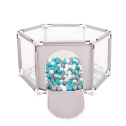 parc bébé hexagonal pliable avec balles plastiques, Gris:gris/blanc/turquoise, 100 balles